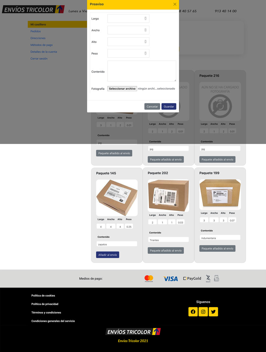 Desarrollo de Plugin para Wordpress y Theme para gestión de casilleros y envíos. Casillero: Carga de Preaviso de paquete entrante.