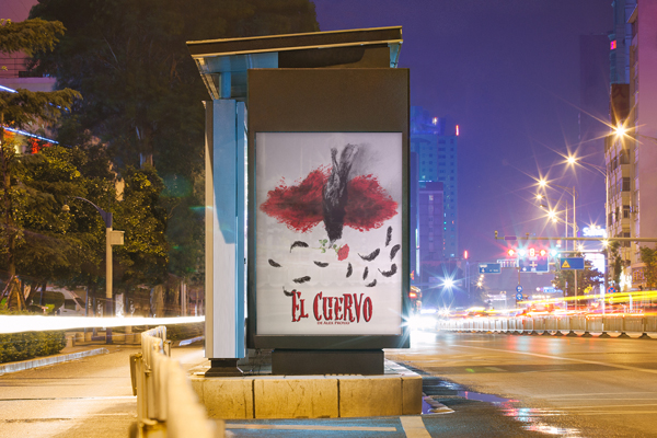 Poster publicitario reversionado, en el cual se construye un discurso visual no redundante, una mirada particular sobre la película “El cuervo”